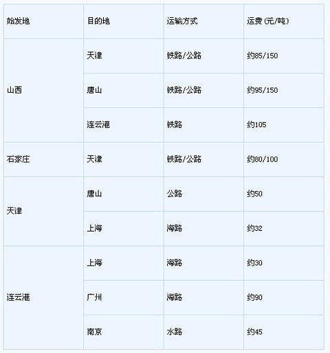 表6 華北各地間焦炭運費情況
