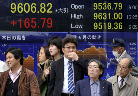 4月20日,在日本首都東京,行人從股價(jià)顯示牌前走過。 受隔夜紐約股市上漲及投資者對上市公司業(yè)績持樂觀期待等因素影響,當(dāng)日東京股市日經(jīng)225種股票價(jià)格指數(shù)上漲1.76%。