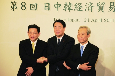 4月24日,中國商務(wù)部部長陳德銘(左)、日本經(jīng)濟產(chǎn)業(yè)大臣海江田萬里(中)與韓國外交通商部通商交涉本部長金宗塤在東京會見記者。