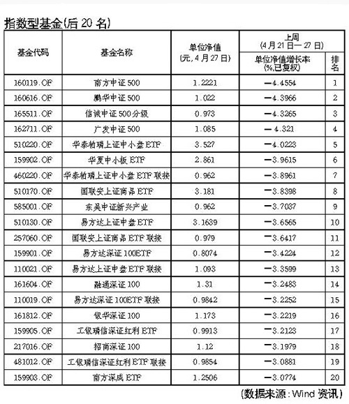 南方基金公司旗下的,2009年8月發(fā)售的南方中證500指數(shù)基金以-4.45%的凈值增長率成為本周(4月21日-27日)指數(shù)型基金收益倒數(shù)第一,其今年以來年漲幅為-3.76%。