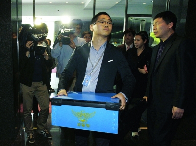 圖為:3日,在韓國首都首爾的谷歌公司辦公室,一名警察搬運(yùn)在此沒收的物品。新華社/路透