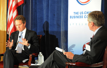 美國(guó)財(cái)政部長(zhǎng)蓋特納當(dāng)?shù)貢r(shí)間3日在美中貿(mào)易全國(guó)委員會(huì)舉辦的座談會(huì)上表示,美國(guó)和中國(guó)在眾多經(jīng)濟(jì)領(lǐng)域擁有廣泛的共同利益,雙方可以進(jìn)一步深化雙邊經(jīng)濟(jì)合作。新華社記者