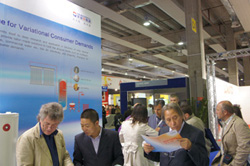 在2011意大利維羅納太陽(yáng)能展上,華揚(yáng)展臺(tái)吸引了眾多觀眾。記者 王星橋