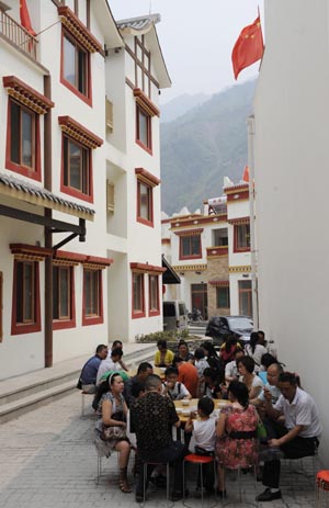 到映秀鎮(zhèn)旅游的游客們在新建好的民房前聚餐。新華社記者 李橋橋/攝