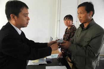 在烏魯木齊市米東區(qū)米東康居苑小區(qū)物業(yè)辦公室,白和西(右)從烏魯木齊房地產(chǎn)開(kāi)發(fā)(集團(tuán))有限公司廉租房管理服務(wù)中心工作人員手中接過(guò)新房鑰匙。