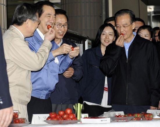 下午,溫家寶和日本首相菅直人、韓國總統(tǒng)李明博一同訪問了福島縣福島市。在接待室里,菅直人請(qǐng)溫家寶和李明博一起品嘗了福島縣出產(chǎn)的櫻桃和小番茄。