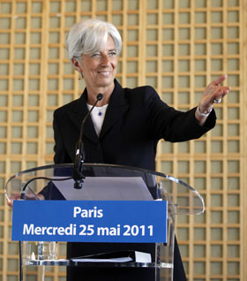 2011年5月25日,法國財(cái)政部長拉加德在法國首都巴黎舉行的新聞發(fā)布會(huì)上講話。