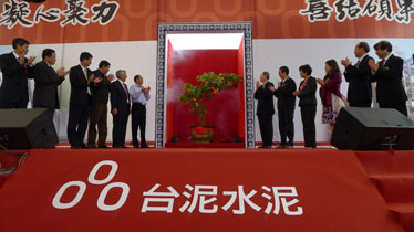| 圖為:臺泥安順一期竣工慶典儀式上,眾領(lǐng)導(dǎo)嘉賓與臺泥董事長辜成允等高層共同“喜迎碩果”。 |
