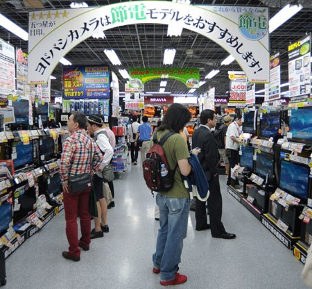 6月9日,在東京秋葉原的淀橋相機連鎖百貨店(Yodobashi Camera)里的專賣電視的商場。 由于日本福島第一核電站事故以及其后續(xù)效應(yīng)所導(dǎo)致的日本全國大范圍的電力供應(yīng)緊張,日本廠商和家電賣場積極推廣節(jié)能電力的空調(diào),電風(fēng)扇,LED燈等家用電器。