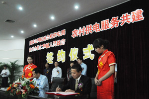 余杭供電局局長童鈞(左)與仁和鎮(zhèn)簽訂《農(nóng)村供電服務共建協(xié)議》。姚學恒