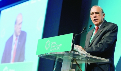 圖為古利亞(Angel Gurria)在首爾舉行的全球綠色增長峰會上演講。