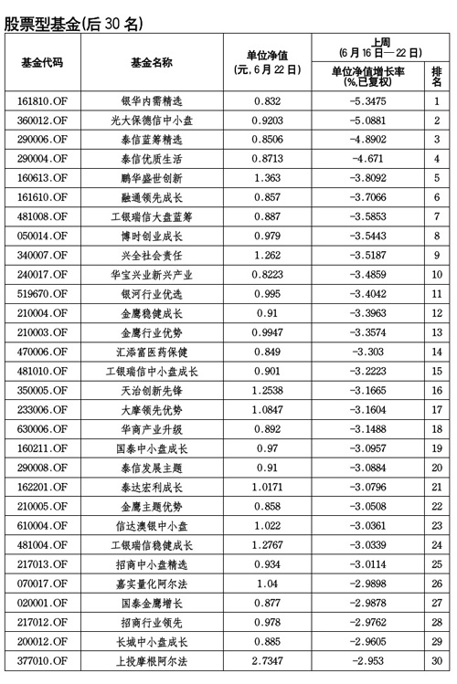 銀華基金管理有限公司旗下的,2009年7月成立的銀華內(nèi)需精選以-5.35%的凈值增長(zhǎng)率成為本周(6月16日-22日)股票型基金收益倒數(shù)第一,其今年年漲幅為-25.01%。