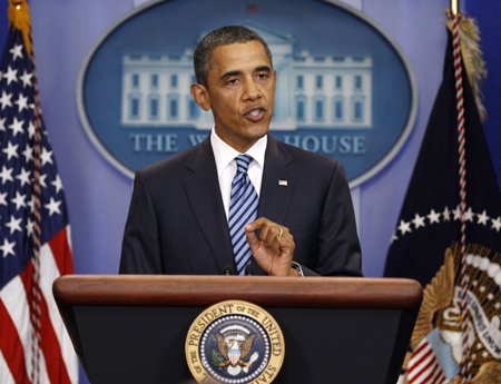 7月5日,在美國(guó)首都華盛頓,美國(guó)總統(tǒng)奧巴馬在白宮舉行的新聞發(fā)布會(huì)上講話。 奧巴馬5日表示,他將于7日與國(guó)會(huì)兩黨領(lǐng)導(dǎo)人在白宮繼續(xù)就削減赤字和提高公共債務(wù)上限議題舉行商討,他強(qiáng)調(diào)兩黨要通過(guò)合作來(lái)推進(jìn)談判進(jìn)程。