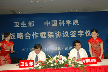 衛(wèi)生部和中科院日前在湖北武漢簽署全面戰(zhàn)略合作框架協(xié)議,雙方依托各自優(yōu)勢機構(gòu)和資源,攜手開展人口健康和生物醫(yī)藥發(fā)展戰(zhàn)略研究,共同推動我國醫(yī)藥科技事業(yè)發(fā)展。圖為衛(wèi)生部部長陳竺和中科院院長白春禮代表雙方在協(xié)議上簽字。新華社記者