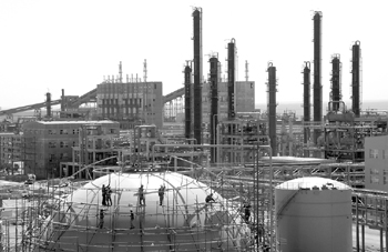 新疆哈密工人在廣匯120萬噸甲醇/80萬噸二甲醚、5億立方米煤制天然氣項(xiàng)目工地上施工。資料照片