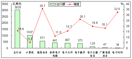整機行業(yè)增速出現(xiàn)分化。上半年,整機行業(yè)出口相對低迷,特別是家電與計算機行業(yè),出口額分別為441和1037億美元,同比增長11.0%和5.2%,增速低于全行業(yè)平均水平4.8和10.6個百分點;通信設(shè)備行業(yè)出口增勢突出,出口額571億美元,同比增長35.7%。6月份,通信設(shè)備行業(yè)出口增速比上月回升22.6個百分點,是拉動行業(yè)出口增速回升的主要動力;家用電器和計算機行業(yè)出口增速分別比上月提高1.6和0.4個百分點。