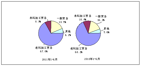 2011年與2010年上半年電子信息產(chǎn)品出口貿(mào)易方式結(jié)構(gòu)對比 |