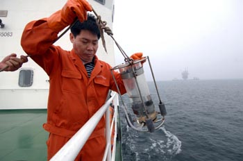蓬萊19-3漏油事故發(fā)生后,國家海洋局北海環(huán)境監(jiān)測中心工作人員在用深層采水器采中層、底層水水樣。記者
