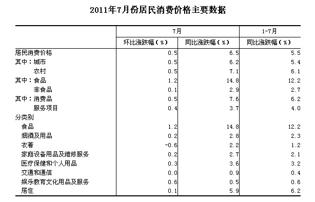 2011年7月份,全國居民消費(fèi)價格總水平同比上漲6.5%。其中,城市上漲6.2%,農(nóng)村上漲7.1%;食品價格上漲14.8%,非食品價格上漲2.9%;消費(fèi)品價格上漲7.6%,服務(wù)項(xiàng)目價格上漲3.7%。全國居民消費(fèi)價格總水平環(huán)比上漲0.5%。其中,城市上漲0.5%,農(nóng)村上漲0.5%;食品價格上漲1.2%,非食品價格上漲0.1%;消費(fèi)品價格上漲0.5%,服務(wù)項(xiàng)目價格上漲0.4%。