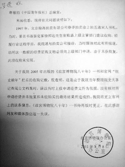 連日來,面對(duì)“私自拍賣館藏五件宋代書札”的質(zhì)疑,故宮博物院方面均予堅(jiān)決否認(rèn)。8月5日,故宮新聞發(fā)言人馮乃恩正式向各媒體表示:“故宮博物院從未競(jìng)買、收藏過網(wǎng)帖中所稱的5件北宋名人書札,更不存在私自拍賣藏品一說。”該說法與此前故宮博物院公共關(guān)系科,給予中國(guó)青年報(bào)的答復(fù)相一致。 但是,故宮博物院官方主頁的“院史編年”一欄中卻明確顯示,1998年有“收購(gòu)宋人書札5件”入藏。其官方出版物《故宮博物院八十年》一書中第177頁“故宮博物院大事記”欄目下,“1997年”一欄中也明確記載:“6月18日,從瀚海拍賣公司拍得宋人書札五件! 對(duì)這一相互矛盾的信息,故宮博物院致函中國(guó)青年報(bào),對(duì)其官方網(wǎng)站及出版物中的“購(gòu)入記錄”作出回應(yīng)。 該回應(yīng)稱,故宮博物院曾就收購(gòu)富弼《兒子帖》等五件宋人書札,而與拍賣公司接洽,但在向上級(jí)部門申請(qǐng)時(shí),經(jīng)費(fèi)未獲批復(fù),因此收購(gòu)實(shí)際上未能實(shí)現(xiàn)。 至于兩項(xiàng)購(gòu)入記錄,故宮博物院稱系因當(dāng)年整理公文檔案時(shí),沒有核對(duì)最終結(jié)果所致,“我院將更正官網(wǎng)上的這條信息,《故宮博物院八十年》一書待再版時(shí)更正! 該函件主要內(nèi)容如下: 1997年,北京翰海拍賣有限公司春季拍賣會(huì)上拍五通宋人書札。當(dāng)時(shí),著名書畫鑒定家徐邦達(dá)先生曾致函上級(jí)主管部門建議收購(gòu),經(jīng)履行論證程序后,我院遂與拍賣公司接洽,當(dāng)時(shí)媒體對(duì)此有所報(bào)道。動(dòng)用這一數(shù)額的經(jīng)費(fèi)征購(gòu)文物必須向上級(jí)部門申請(qǐng),由于未獲批復(fù),此項(xiàng)收購(gòu)未實(shí)現(xiàn)。 關(guān)于我院2005年出版的《故宮博物院八十年》一書和官網(wǎng)“院史編年”欄目的收購(gòu)記載,現(xiàn)查明,這是由于我院當(dāng)年整理院史大事記查閱公文檔案時(shí),誤以當(dāng)時(shí)上報(bào)申請(qǐng)經(jīng)費(fèi)文件為依據(jù),沒有核對(duì)所申請(qǐng)經(jīng)費(fèi)并未批復(fù)和未能購(gòu)買的最終結(jié)果所造成的。我院將更正官網(wǎng)上的這條信息,《故宮博物院八十年》一書待再版時(shí)更正。在此感謝網(wǎng)友和媒體指出這一失誤。 函件落款“故宮博物院辦公室”,時(shí)間為2011年8月8日。