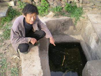 村民劉佃滿蹲在村頭一個一米見方的小水窖邊告訴記者,他今年61歲了,從小水窖里挑水吃差不多挑了50年。記者 李鈞德/ 攝