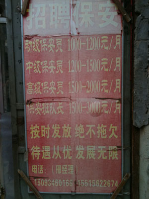 在鄭州火車站布廠街附近,沿著一條窄窄的胡同走進(jìn)去,一棟兩層小樓毫不起眼地立在三岔路口,第二層的部分外墻甚至都沒粉刷,紅色磚頭清晰可見。樓下是一塊“招聘保安”的廣告牌,因?yàn)轱L(fēng)吹雨淋,底色已經(jīng)由紅變白。上面依次寫著初級(jí)、中級(jí)、高級(jí)保安員以及保安隊(duì)長(zhǎng)的月薪,并且承諾“按時(shí)發(fā)放,絕不拖欠,待遇從優(yōu),發(fā)展無限。”
