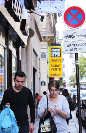 歐、美債務(wù)危機(jī)支撐金價連破新高。8月8日,人們走過位于法國巴黎街頭的黃金交易所。記者 高靜