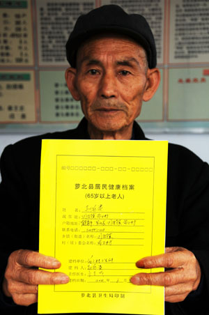 2009年,黑龍江省蘿北縣被確定為該省首批基層醫(yī)藥衛(wèi)生體制綜合改革試點縣之一,經(jīng)過兩年的摸索,蘿北的基層醫(yī)改不僅讓百姓卸下了看病的“包袱”,還提高了醫(yī)務工作者的經(jīng)濟回報。 2010年3月1日,蘿北縣實施國家基本藥物制度工作在全縣鄉(xiāng)鎮(zhèn)衛(wèi)生院正式啟動,各鄉(xiāng)鎮(zhèn)衛(wèi)生院藥品實行了網(wǎng)上統(tǒng)一招標采購,并實行了零差率銷售,不允許自購目錄外的藥品。 羅興臣患有冠心病,于2009年冬天在蘿北縣醫(yī)院住院,包括用藥、檢查和處置等一共花了5932.78元,減掉300元的基本額度和目錄外用藥,只能報銷45%,而今年住院費的報銷比例提高到了60%,當?shù)蒯t(yī)院又補給她15%的錢。圖為一位老人手持著蘿北縣為他制作的個人健康檔案。新華社記者