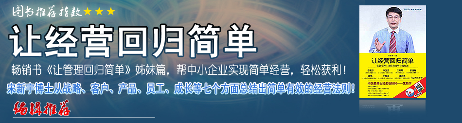 在《讓經(jīng)營回歸簡單》一書中,宋新宇博士站在成長型企業(yè)經(jīng)營者的角度,根據(jù)多年的實踐和研究,從“老板自身”、“戰(zhàn)略”、“客戶”、“產品”、