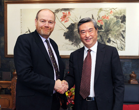 圖為9月28日,新華通訊社社長(zhǎng)李從軍在北京釣魚(yú)臺(tái)國(guó)賓館會(huì)見(jiàn)出席峰會(huì)的英國(guó)廣播公司總裁馬克·湯普森。