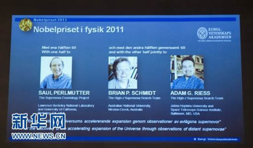 瑞典皇家科學院4日宣布,將2011年諾貝爾物理學獎授予美國科學家索爾·珀爾馬特(前譯索爾·佩爾馬特)、擁有美國和澳大利亞雙重國籍的科學家布賴恩·施密特(前譯布萊恩·施密特)以及美國科學家亞當·里斯,以表彰他們在天體物理學方面的卓越研究成果。