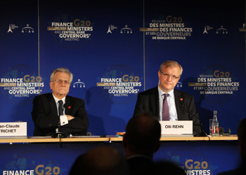 10月15日,在法國巴黎,歐洲中央銀行行長特里謝(左)和歐盟負(fù)責(zé)經(jīng)濟(jì)和貨幣事務(wù)委員奧利·雷恩在二十國集團(tuán)(G20)財長和央行行長會議后參加新聞發(fā)布會。新華社記者