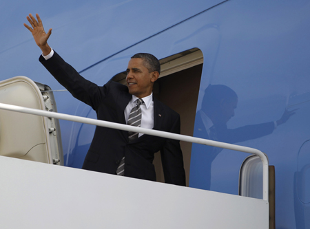 圖為奧巴馬24日啟程前在飛機(jī)上揮手。