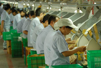 勤勞地三峽移民們?cè)诋?dāng)?shù)啬臼崦駹I(yíng)企業(yè)“譚木匠”的生產(chǎn)線上緊張工作。 三峽庫(kù)區(qū)重鎮(zhèn)重慶市萬(wàn)州區(qū)推進(jìn)城鄉(xiāng)移民“零就業(yè)家庭”工程,在2006年6月成功實(shí)現(xiàn)當(dāng)?shù)爻青l(xiāng)移民家庭至少有一人就業(yè)或轉(zhuǎn)移就業(yè)的目標(biāo)。近萬(wàn)名三峽移民在當(dāng)?shù)卣膸椭抡业搅俗约旱墓ぷ鲘徫。記?