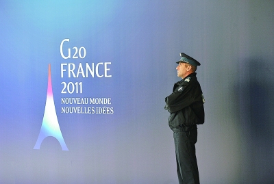 11月2日,在法國南部海濱城市戛納,一名警察站在二十國集團(tuán)峰會的標(biāo)志旁。