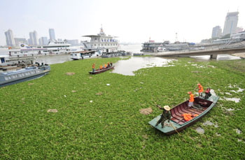 圖為8月29日武漢水上管理處清漂隊員在長江武漢段打撈水葫蘆。當時,密密麻麻的水葫蘆綿延達數十公里。新華社發(fā)(葉火生/攝)