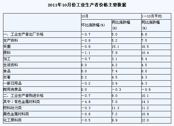 2011年10月份,全國工業(yè)生產(chǎn)者出廠價格比上月下降0.7%,比去年同月上漲5.0%。工業(yè)生產(chǎn)者購進價格比上月下降0.7%,比去年同月上漲8.0%。2011年1—10月,工業(yè)生產(chǎn)者出廠價格平均同比上漲6.8%,工業(yè)生產(chǎn)者購進價格平均同比上漲10.1%。
