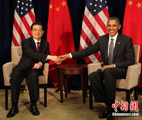 當(dāng)?shù)貢r(shí)間11月12日下午,中國國家主席胡錦濤在夏威夷州首府檀香山會(huì)見美國總統(tǒng)奧巴馬。中美兩國元首十天之內(nèi)再次會(huì)晤。中新社發(fā) 張朔 攝