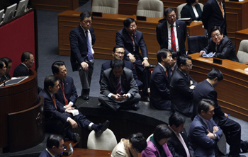 韓美自貿(mào)協(xié)定在韓國備受爭議,尤其是執(zhí)政黨和在野黨對此意見分歧極大。 圖為11月22日,在韓國首爾,韓國在野黨議員在韓國執(zhí)政黨單獨(dú)表決通過了韓美自由貿(mào)易協(xié)定履行法案后聚集在國會會場。新華社/路透 |
