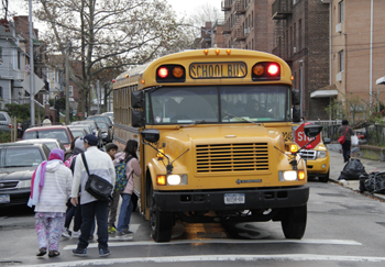 一輛享有特權(quán)的美國校車清晨在美國紐約皇后區(qū)一街道上接送學(xué)生。記者 王成云