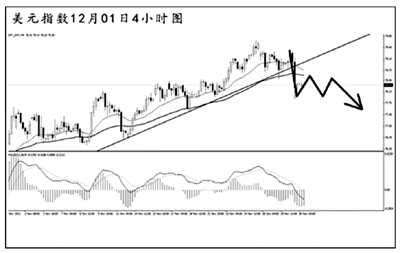 從圖中看,美元指數(shù)未能持續(xù)上行挑戰(zhàn)79.80的阻力,短線價格回落,已經(jīng)將4小時圖的上升通道下沿跌破,MACD進入到空頭動能充盈的階段。小時圖均線系統(tǒng)已經(jīng)轉(zhuǎn)為空頭排列,且主次節(jié)奏向下,美元指數(shù)后市繼續(xù)下跌的概率很大。短線需首先關(guān)注道氏低點77.50的支撐作用。