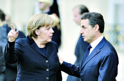 圖為默克爾(左)當日在會談結(jié)束后與薩科齊交談。