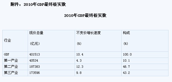 2010年GDP現(xiàn)價總量為401513億元,比初步核實數(shù)增加了311億元;按不變價格計算,比上年增長10.4%,與初步核實數(shù)相同(詳見附件)。