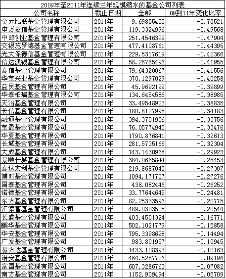 2011年,基金整體資產(chǎn)管理規(guī)?s水12.45%,其中更是有62只基金逼近清盤邊緣。 Wind統(tǒng)計(jì)顯示,截至2011年12月31日,來自37家基金公司的高達(dá)62只開放式基金的資產(chǎn)管理規(guī)模在1億元以下。而其中寶盈中證100、國聯(lián)安紅利、長信標(biāo)普100等權(quán)重基金的規(guī)模已經(jīng)低于5000萬元的“清盤”紅線。 所謂清盤紅線,根據(jù)2004年頒布的《證券投資基金運(yùn)作管理辦法》第四十四條規(guī)定:“開放式基金的基金合同生效后,基金份額持有人數(shù)量不滿200人或者基金資產(chǎn)凈值低于5000萬元的,基金管理人應(yīng)當(dāng)及時(shí)報(bào)告中國證監(jiān)會;連續(xù)20個(gè)工作日出現(xiàn)前述情形的,基金管理人應(yīng)當(dāng)向中國證監(jiān)會說明原因和報(bào)送解決方案。” 2011年雖然基金數(shù)量快速擴(kuò)張,總數(shù)量從2010年底的704只增加到2011年底的914只,增長幅度超過29%,為歷年來發(fā)行數(shù)量最多的一年。但基金管理資產(chǎn)的總規(guī)模在2011年大幅縮水,從2010年底的2.4972萬億元下降12.45%至2.1864萬億元!笆袌鲂星椴患眩鹛潛p嚴(yán)重是造成基金管理資產(chǎn)縮水的主要原因。”好買基金研究中心陸慧天表示。 從單只基金的管理規(guī)模來看,在逼近清盤線的62只基金中偏股基金就以30只的數(shù)量占據(jù)了半壁江山。此外,債券型基金13只、貨幣基金3只和QDII基金16只。 Wind數(shù)據(jù)顯示,截至2011年12月31日,共有30只股票型和混合型基金的規(guī)模小于1億元,且大部分資產(chǎn)規(guī)模在1億元以下的偏股型基金是受累于規(guī)模持續(xù)縮水的老基金。規(guī)模排名后十位的股票及混合型基金分別有,寶盈中證100、國聯(lián)安紅利、申萬菱信盛利配置、天治趨勢精選、泰信優(yōu)勢增長、天弘永定成長、華泰柏瑞上證中小盤ETF聯(lián)接、金元比聯(lián)核心動力、華富策略精選,其管理規(guī)模依次為0.4724億元、0.4825億元、0.5066億元、0.5174億元、0.5755億元、0.5833億元、0.6046億元、0.6204億元、0.6297億元、0.663億元。此外,2011年規(guī)模前三的都是指數(shù)型基金,分別是嘉實(shí)滬深300、華夏上證50ETF、易方達(dá)上證50,管理規(guī)模分別為260億元、209億元和194億元。值得注意的是,國聯(lián)安紅利和寶盈中證100的管理規(guī)模已經(jīng)跌破5000萬的清盤“紅線”! 游走在清盤線邊緣的QDII基金中,長信標(biāo)普100等權(quán)重的規(guī)模已低于5000萬,僅有近4709萬。2011年3月30日剛剛成立的長信標(biāo)普100等權(quán)重目前的累計(jì)單位凈值為0.949元。此外,景順長城大中華、國投瑞銀新興市場、長盛環(huán)球景氣行業(yè)、博時(shí)大中華亞太精選等基金的管理規(guī)模也游走于5000萬附近。 規(guī)模低于1億元的13只債券型基金方面,2009年下半年成立的浦銀安盛優(yōu)化收益的規(guī)模最低,為5313萬,2008年成立的天治穩(wěn)健雙盈以5674萬的規(guī)模緊隨其后。此外,匯豐晉信平穩(wěn)增利、信達(dá)澳銀穩(wěn)定、信誠三得益?zhèn)纫参涣邪駟巍?BR>此外,一些“僵尸基金”的規(guī)模還在不斷減少。比如,三季度末,銀河藍(lán)籌精選縮水率逾33%,其截至12月31日資產(chǎn)凈值規(guī)模僅為0.89億元,而三季度末時(shí)該數(shù)值為1.35億元。 “由于基金的總規(guī)模在縮水,但個(gè)數(shù)不斷增多,因此小基金的個(gè)數(shù)也越來越多,對于這些小于1億元的基金來說,面臨一定的清盤風(fēng)險(xiǎn)!标懟厶熘赋。但是,業(yè)內(nèi)人士同時(shí)指出,由于基金被清盤處理對公司整體形象不利,所以發(fā)生清盤的可能性很低,投資者不需要過分擔(dān)心;鸸疽话愣紩扇【燃贝胧热鐚ふ叶唐诰葓鲑Y金幫忙、加大營銷力度吸引資金申購、或者基金公司動用自有資金進(jìn)行申購等。