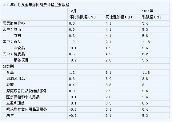 2011年12月份,全國居民消費(fèi)價(jià)格總水平同比上漲4.1%。其中,城市上漲4.1%,農(nóng)村上漲4.1%;食品價(jià)格上漲9.1%,非食品價(jià)格上漲1.9%;消費(fèi)品價(jià)格上漲4.9%,服務(wù)項(xiàng)目?jī)r(jià)格上漲2.0%。全國居民消費(fèi)價(jià)格總水平環(huán)比上漲0.3%。其中,城市上漲0.3%,農(nóng)村上漲0.3%;食品價(jià)格上漲1.2%,非食品價(jià)格下降0.1%;消費(fèi)品價(jià)格上漲0.5%,服務(wù)項(xiàng)目?jī)r(jià)格下降0.2%。2011年,全國居民消費(fèi)價(jià)格總水平比上年上漲5.4%。
