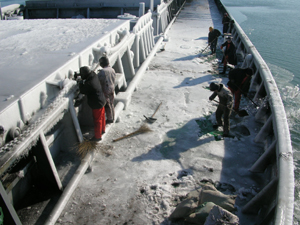 隸屬神華中海航運有限公司的京驊、滬驊、粵驊輪,是為了緩解綏中、黃驊、秦皇島華中地區(qū)燃煤供應(yīng)緊張的局面而投入運營的。三驊輪長期運營在綏中、黃驊一帶沿海地區(qū),這些港囗一到冬季海面結(jié)冰情況非常嚴(yán)重。今年三驊輪提前做好冬防安全準(zhǔn)備,組織人員排查安全隱患,由于三驊輪的特殊構(gòu)造,冬季容易發(fā)生爆艙事故,為了防止事故發(fā)生,船舶安排專人堅持每天冒著嚴(yán)寒幾次對壓載艙進(jìn)行測量,防止突發(fā)事故,保證電煤的運輸安全。資料照片 |