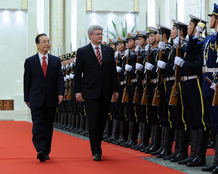 圖為溫家寶總理在北京人民大會(huì)堂舉行儀式歡迎加拿大總理斯蒂芬·哈珀訪華。