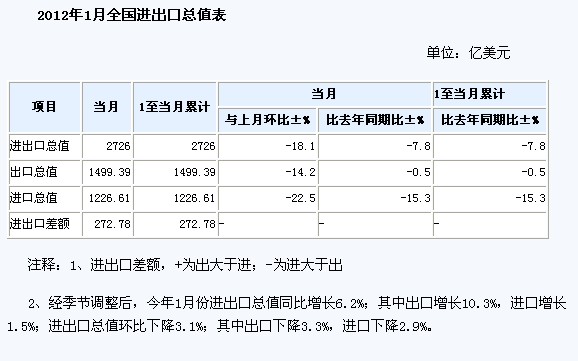 海關(guān)總署10日公布今年首月我國(guó)外貿(mào)進(jìn)出口情況。據(jù)海關(guān)統(tǒng)計(jì),2012年1月份,我國(guó)對(duì)外貿(mào)易進(jìn)出口總值2726億美元,比去年同期(下同)下降7.8%。其中出口1499.4億美元,下降0.5%;進(jìn)口1226.6億美元,下降15.3%。貿(mào)易順差272.8億美元。