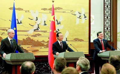 國務(wù)院總理溫家寶14日在人民大會堂與歐洲理事會主席范龍佩、歐盟委員會主席巴羅佐共同主持第十四次中歐領(lǐng)導(dǎo)人會晤。