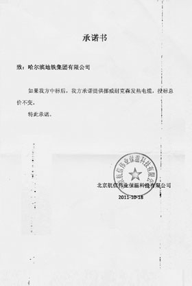 這個(gè)補(bǔ)救辦法就是寫(xiě)一份《承諾書(shū)》。記者拿到了這份印有“北京航信偉業(yè)保溫科技有限公司”公章,由航信偉業(yè)向哈爾濱地鐵集團(tuán)公司出具的《承諾書(shū)》,《承諾書(shū)》稱(chēng):“如果我方中標(biāo)后,我方承諾提供挪威耐克森發(fā)熱電纜,投標(biāo)總價(jià)不變!痹摗冻兄Z書(shū)》的落款時(shí)間是2011年10月18日,即中標(biāo)公告發(fā)布前一天。